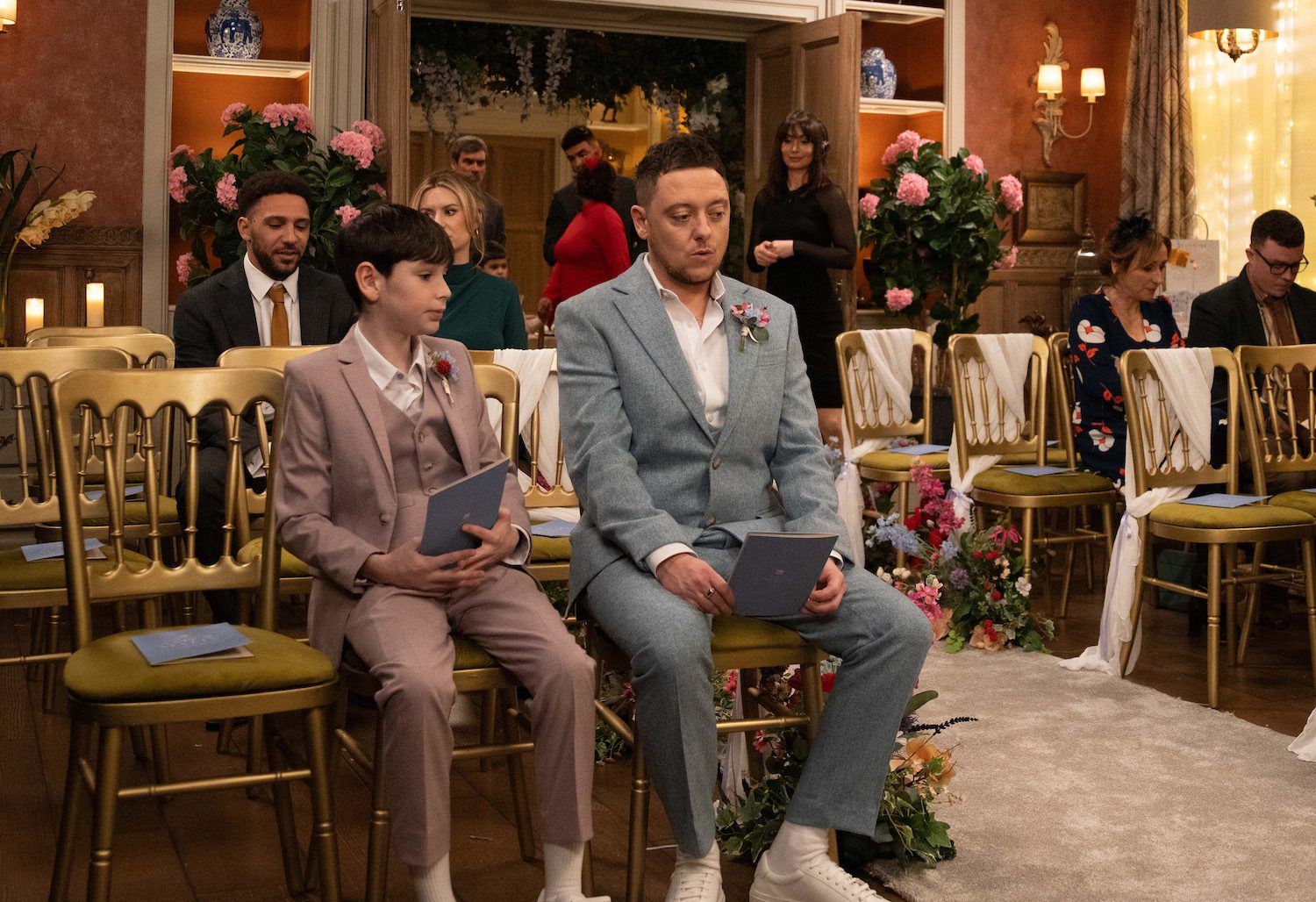 Beaming Amy is walked down the aisle by Pollard as Matty waits at the end.