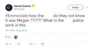 Why isn’t anyone questioning Megan, can’t they see her car smashed into the one in front #Emmerdale