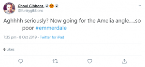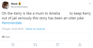 ugh here I thought Amy & Kerry would get what they deserve & get gone.#Emmerdale— Jehan (@1stLadyHooligan) October 8, 2019