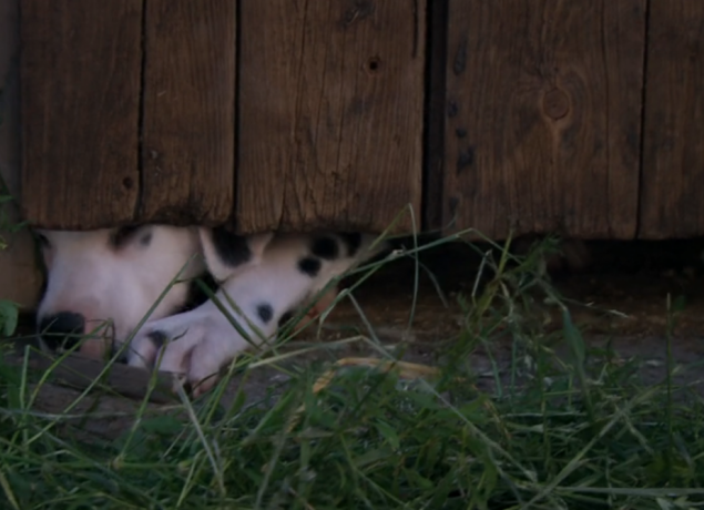 But they were soon distracted by the sound of whimpering – and quickly noticed pooches struggling to escape the barn.