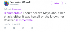 In a Digital Spy forum called “ED – The attack on Maya” a user wrote: “Who do people think attacked Maya? She said a random woman but I’m hoping that the attack was actually Alicia and she somehow knew about the Jacob and Maya affair.”