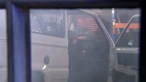 Nate urgently tries to break open the garage door to save Kyle from the fumes.