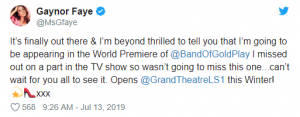 The actress tweeted: “It’s finally out there & I’m beyond thrilled to tell you that I’m going to be appearing in the World Premiere of @BandOfGoldPlay.