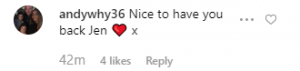 Andy Whyment, who plays Fiz’s friend and ex-boyfriend Kirk Sutherland commented “Nice to have you back Jen x.”
