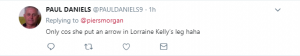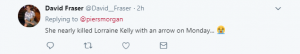 One wrote “Only cos she put an arrow in Lorraine Kelly’s leg haha” [sic]