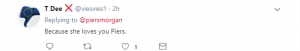 Someone else joked: “Because she loves you Piers.”