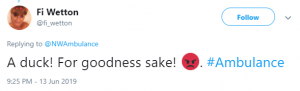 A third wrote, alongside an angry-face emoji: “A duck! For goodness sake! #Ambulance.”