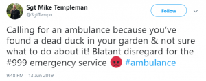 A fifth said: “Calling for an ambulance because you’ve found a dead duck in your garden & not sure what to do about it! Blatant disregard for the #999 emergency service #ambulance.”