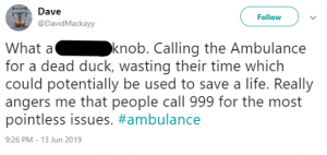 One said: “What a [bleeping] knob. Calling the Ambulance for a dead duck, wasting their time which could potentially be used to save a life. Really angers me that people call 999 for the most pointless issues. #ambulance.”