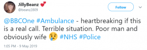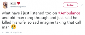 One said on Twitter: “What have I just listened to on #Ambulance, an old man rang through and just said he killed his wife. So sad, imagine taking that call man.”