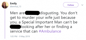 Someone fumed: “Men are [bleeping] disgusting. You don’t get to murder your wife just because you, a Special Important Man, can’t be [bleeped] looking after her or finding a service that can.”
