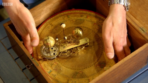 The pair featured with a plain wooden box containing an intricate clockwork model of the solar system.