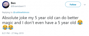 A third wrote alongside a string of crying-laughing emojis: “Absolute joke, my five year old can do better magic and I don’t even have a five year old.”