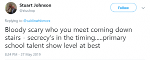 A fourth said: “Bloody scary who you meet coming down stairs – secrecy’s in the timing… primary school talent show level at best.”