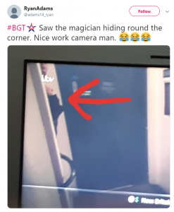 Someone else tweeted: “Sorry, saw the arm,” while another said: “#BGT Saw the magician hiding round the corner. Nice work camera man.”