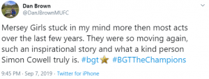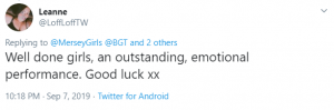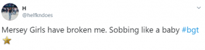 “Watched bgt tonight and I’m in bits watching the Mersey girls, well done to them they deserved to get through,” wrote one.