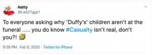 However, not everyone was as confused with the scriptwriters’ decision. Natty said: “To everyone asking why Duffy’s children aren’t at the funeral… you do know Casualty isn’t real, don’t you?!”