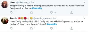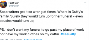 One viewer tweeted: “Soap writers get it so wrong at times. Where is Duffy’s family? Surely they would turn up for her funeral? Even cousins would turn up. PS I don’t want my funeral to go past my place of work nor have my work clothes on my coffin.”