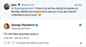 In another tweet on the same day (Tuesday 20 March), George told a disappointed fan hoping to meet him at the studios: “I’m not here anymore sorry.”