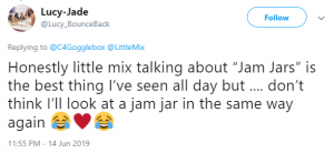 “Honestly Little Mix talking about ‘jam jars’ is the best thing I’ve seen all day. Don’t think I’ll look at a jam jar in the same way again!” one laughed.