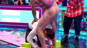 First up was You’re Beautiful singer James who cart wheeled his way towards Robin before completely taking him out as he struggled to get through his legs. After botching his attempt and not winning any points, it was Mark’s turn.