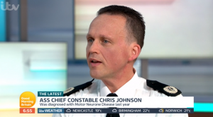 During Friday’s Good Morning Britain, the presenter spoke to ASS Chief Constable Chris Johnson and his wife Sharon about him battling the terminal illness.