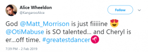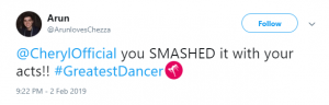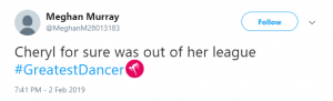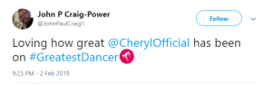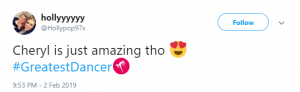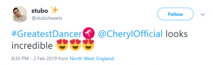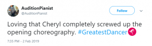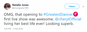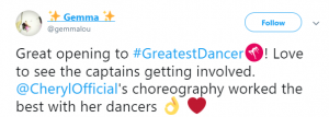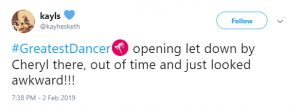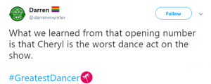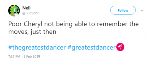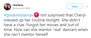 “#GreatestDancer opening let down by Cheryl there, out of time and just looked awkward!!!” said a third, while a fourth said: “Not surprised that Cheryl messed up her routine tonight. She didn’t have a clue. Forgot her moves and out of time. How can she mentor ‘real’ dancers when she can’t mentor herself.”
