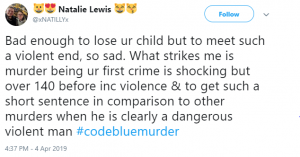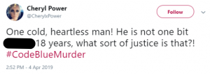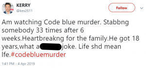 Another said: “I’m watching Code Blue: Murder. Stabbing somebody 33 times after six weeks. Heartbreaking for the family. He got 18 years, what a [bleeping] joke. Life should mean life.”