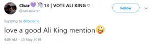 One said: “Love a good Ali King mention.”