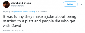 Another wrote: “It was funny they make a joke about being married to a Platt and people die who get with David.”