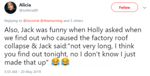 Someone else tweeted: “Also, Jack was funny when Holly asked when we find out who caused the factory roof collapse & Jack said, ‘Not very long, I think you find out tonight, no I don’t know I just made that up’.”