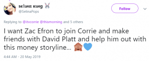 A fourth said: “I want Zac Efron to join Corrie and make friends with David Platt and help him out with this money storyline…”