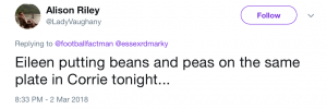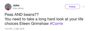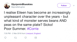Poor Eileen’s culinary skills were massively mocked on social media as viewers took to Twitter so share their disgust at the fact she’d served up fish fingers, chips, peas AND beans.