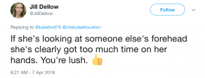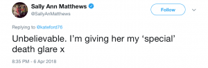 Sally lightened the mood brilliantly by suggesting that she would give the online hater one of her ‘death stares’ which she is famous for in Corrie.