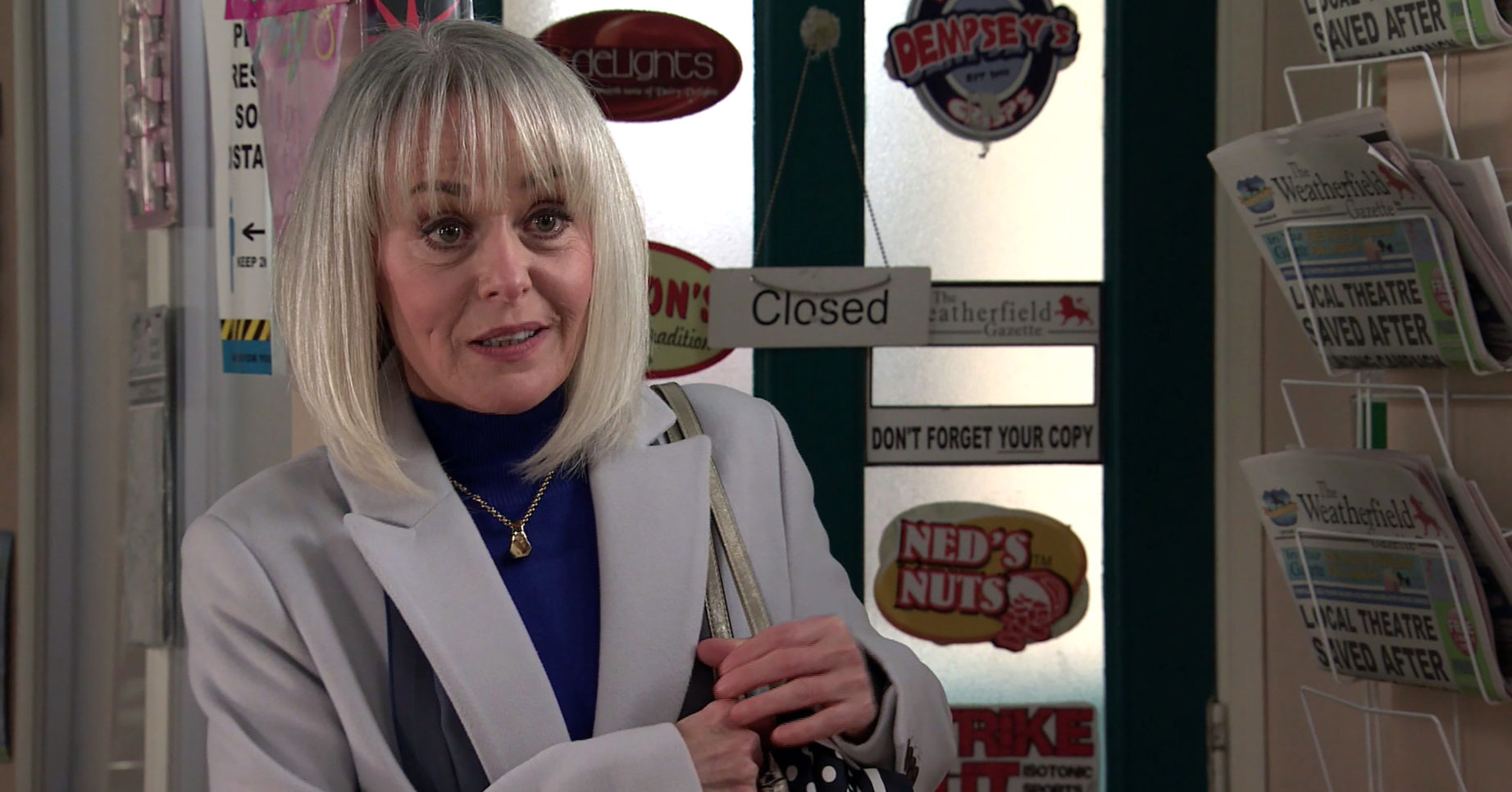 The actress, 59, plays Sharon Bentley on the ITV soap.