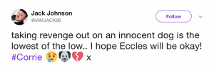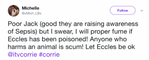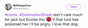 Fans took to social media to share their outrage at the storyline that saw Eccles the dog eat a sausage, laced with slug pellets, that Tyler put under the gate at number 1.