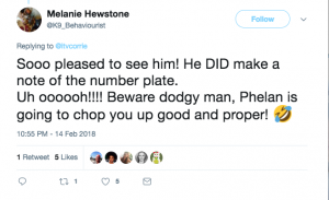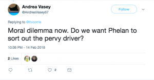 “Moral dilemma now,” mused one fan. “Do we want Phelan to sort out the pervy driver?”
