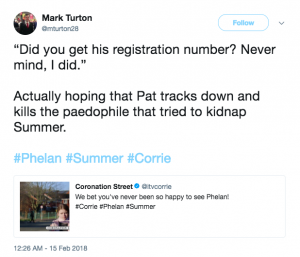 And another agreed: “Actually hoping that Pat tracks down and kills the paedophile that tried to kidnap Summer.”