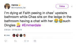 “I’m dying at Faith peeing in chas’ upstairs bathroom while Chas sits on the ledge in the bathroom having a chat with her such Dingles,” howled one amused viewer.