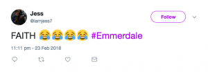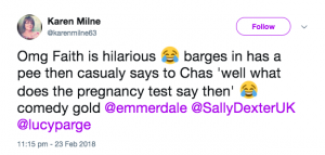 Another added: “Omg Faith is hilarious barges in has a pee then casualy says to Chas ‘well what does the pregnancy test say then’ comedy gold.”