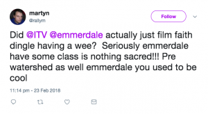 “Did ITV Emmerdale actually just film faith dingle having a wee? Seriously emmerdale have some class is nothing sacred!!! Pre watershed as well emmerdale you used to be cool,” ranted one unimpressed viewer.