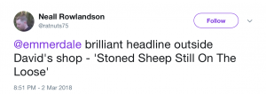 The front page headline was seen on a sandwich board outside David’s shop and read: “Stoned Sheep On The Loose”.
