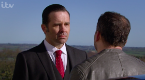 Later, while she’s at Home Farm hanging some fairy lights, the ladder collapses leaving Megan literally hanging around.