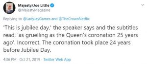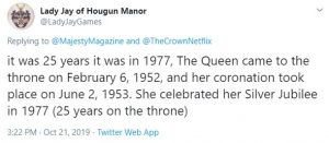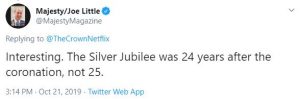 Responding to a tweet from The Crown’s official Twitter account, one fan pointed out: “Interesting. The Silver Jubilee was 24 years after the coronation, not 25.”