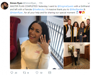 Simon wrote: “MASTER PLAN COMPLETED! Yesterday I went to @EnigmaQuests with a Girlfriend and left with a Fiancée @itsellaruby”.