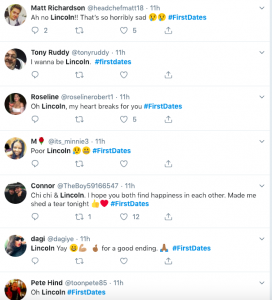 Another said simply: “Lincoln 😪😪😪😪 #FirstDates.”