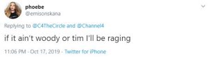 A third wrote: “If it ain’t Woody or Tim, I’ll be raging.”