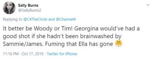 Someone else replied: “It better be Woody or Tim! Georgina would’ve had a good shot if she hadn’t been brainwashed by Sammie/James. Fuming that Ella has gone.”