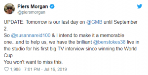 Ahead of today’s show, Piers wrote on Twitter on Tuesday: “UPDATE: Tomorrow is our last day on @GMB until September 2.