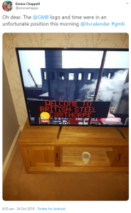 However, the GMB’s yellow logo and clock was unfortunately covering the ‘S’, making the sign read: “Welcome to British Steel [Expletive]horpe.”